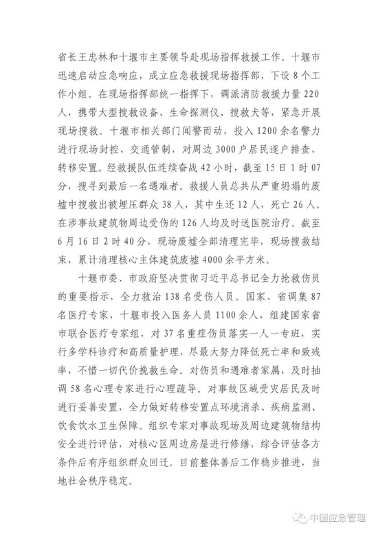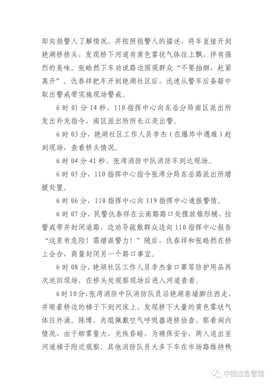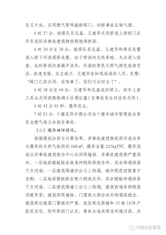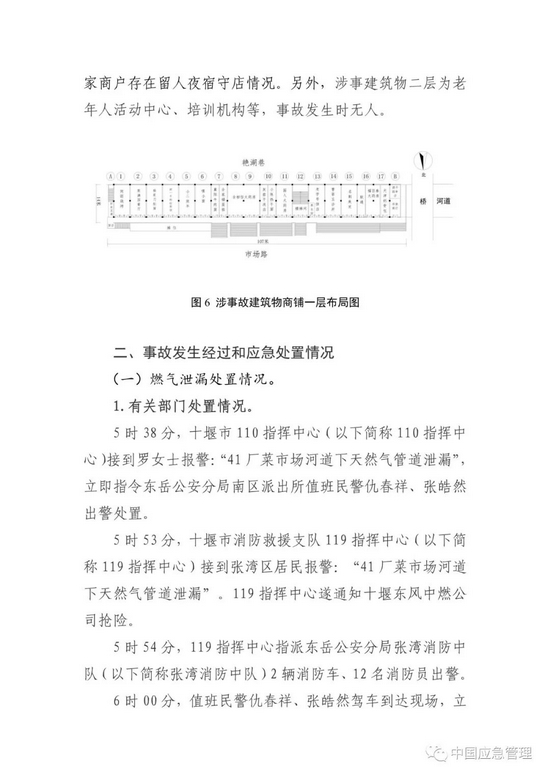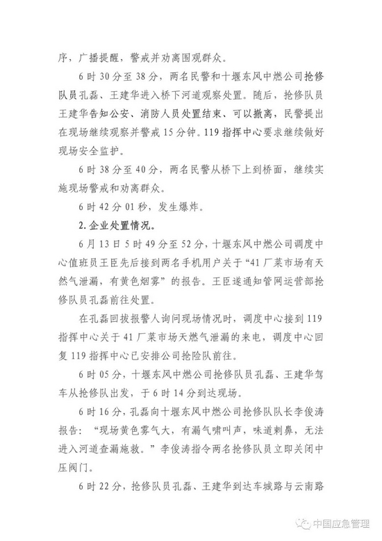 사건 1 시간 전에 Shiyan City 110 Command Center는 파이프 라인 유출 경보에 대한 요청을 받았으며 경찰을 현장에 보냈습니다. 가스 회사는 또한 비상 수리 요원을 보냈습니다. 비상 수리 8 분 후, 응급 수리 요원은 공공 보안과 소방관에게 취급이 완료되었고 대피 할 수 있다고 알렸다. 경찰과 소방관들은 현장에서 안전 감독을 계속 관찰하고 보호했습니다. 4 분 후에 폭발이 발생했습니다.