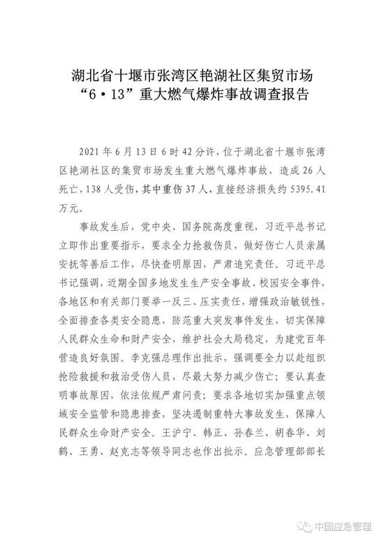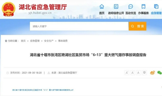 9 월 30 일, Hubei 지방 응급 관리 부의 공식 웹 사이트는 "Hubei Province의 Shiyan City, Zhangwan 지구의 Yanhu Community Market의"6.13 "주요 가스 폭발 토토 꽁 머니에 관한 조사 보고서를 발표했습니다. 토토 꽁 머니 조사 팀은이 주요 가스 폭발 토토 꽁 머니가 주요 생산 안전 책임 토토 꽁 머니라고 판단했습니다.