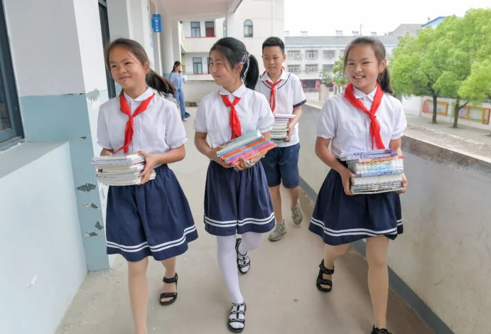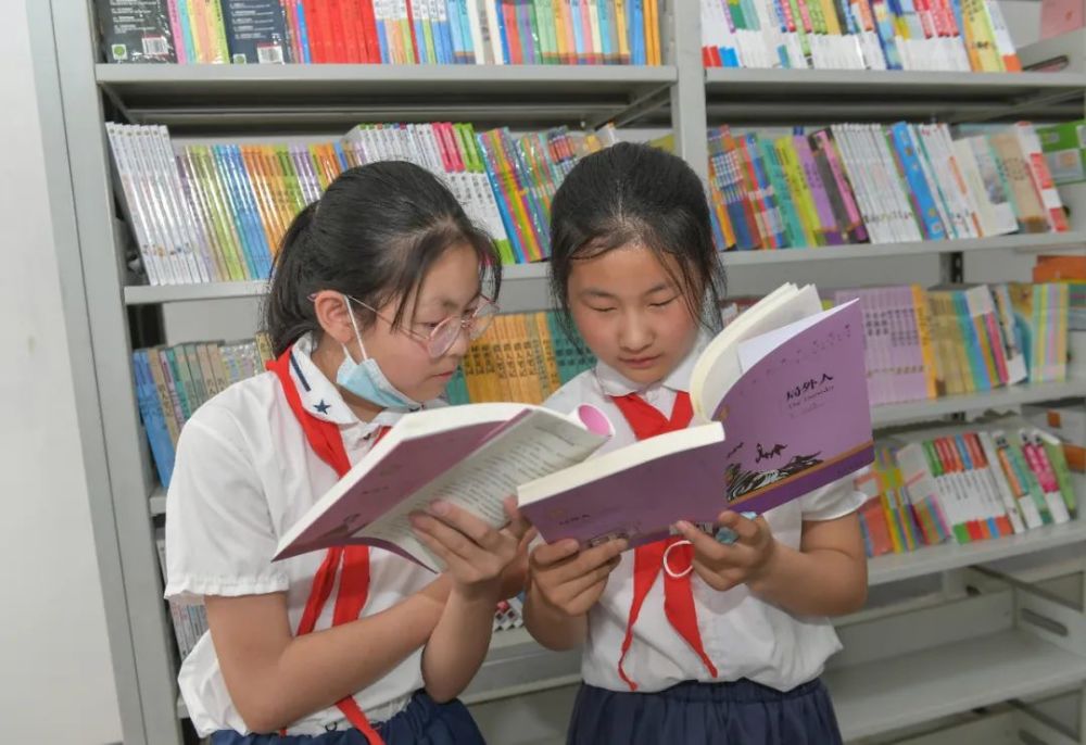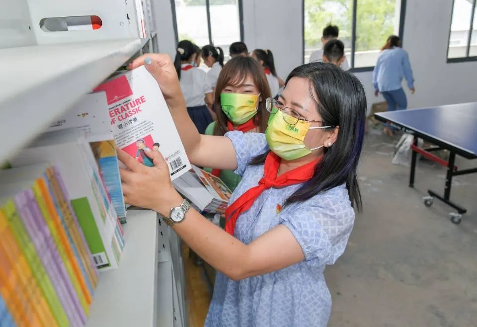 산들 바람은 부드럽고 태양이 밝게 빛납니다 Zhuhu Central 초등학교의 2 층에있는 도서관에서 아이들은 잉크의 향기를 방출하는 새로운 책을 흥분하고 있습니다