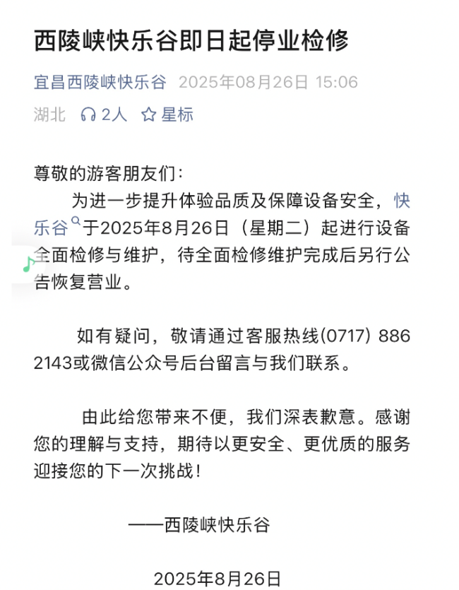 기자는 8 월 26 일 오후 3시에 Xilingxia Happy Valley Scenic Area가 포괄적 인 장비 유지 보수를 수행하기 위해 폐쇄 및 유지 보수 통지를 발행 한 것으로 나타났습니다 기자는 경치 좋은 지점의 직원에게 연락하여 번지 점프 사고가 여전히 이해되고 있다고 말했지만 수리 통지와 사고 사이의 관계를 거부했습니다